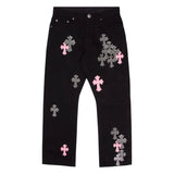 Chrome Hearts Fleurknee Jeans - Pink & Checkered Cross Patch (Black)