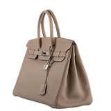 Neutral elegance defines the Hermes Birkin 35 in timeless Gris Tourterelle Togo leather, accented with sleek palladium hardware. This iconic silhouette is crafted to perfection for refined sophistication and enduring style.