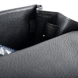 The Retourne style features rounded edges and visible piping. Its flexible construction allows for easier access and packing. The bag has a single rolled top handle and a removable shoulder strap. The front flap secures with dual straps and a central toggle closure, while the interior is lined with black Chevre leather for added durability and a polished feel.