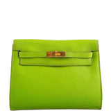 The Hermes Kelly Danse II is a convertible interpretation of the classic Kelly bag. This handbag is crafted in Vert Cru Swift leather, a vibrant apple green shade that is both lively and sophisticated. The Swift leather is known for its fine grain and soft touch, and the design is finished with polished gold-tone hardware, creating a striking and adaptable accessory.