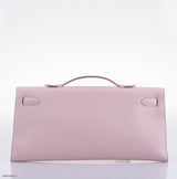 The Hermes Kelly Longue is a clutch-style bag with a distinct trapezoidal shape, which preceded the Hermes Kelly Cut. This bag is crafted from Rose Dragee Evergrain leather, a delicate pink shade with a subtle, fine grain. The design is finished with polished palladium-tone hardware, providing a modern and refined contrast.