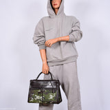 The Vintage Hermes Kelly Lakis 35 is a rare reinterpretation of the classic Retourne Kelly. This edition is crafted from rich Chocolate Box Calf leather and features Officier Toile canvas panels, which have been custom hand-painted with a camouflage motif. The design is complemented by palladium-tone hardware.